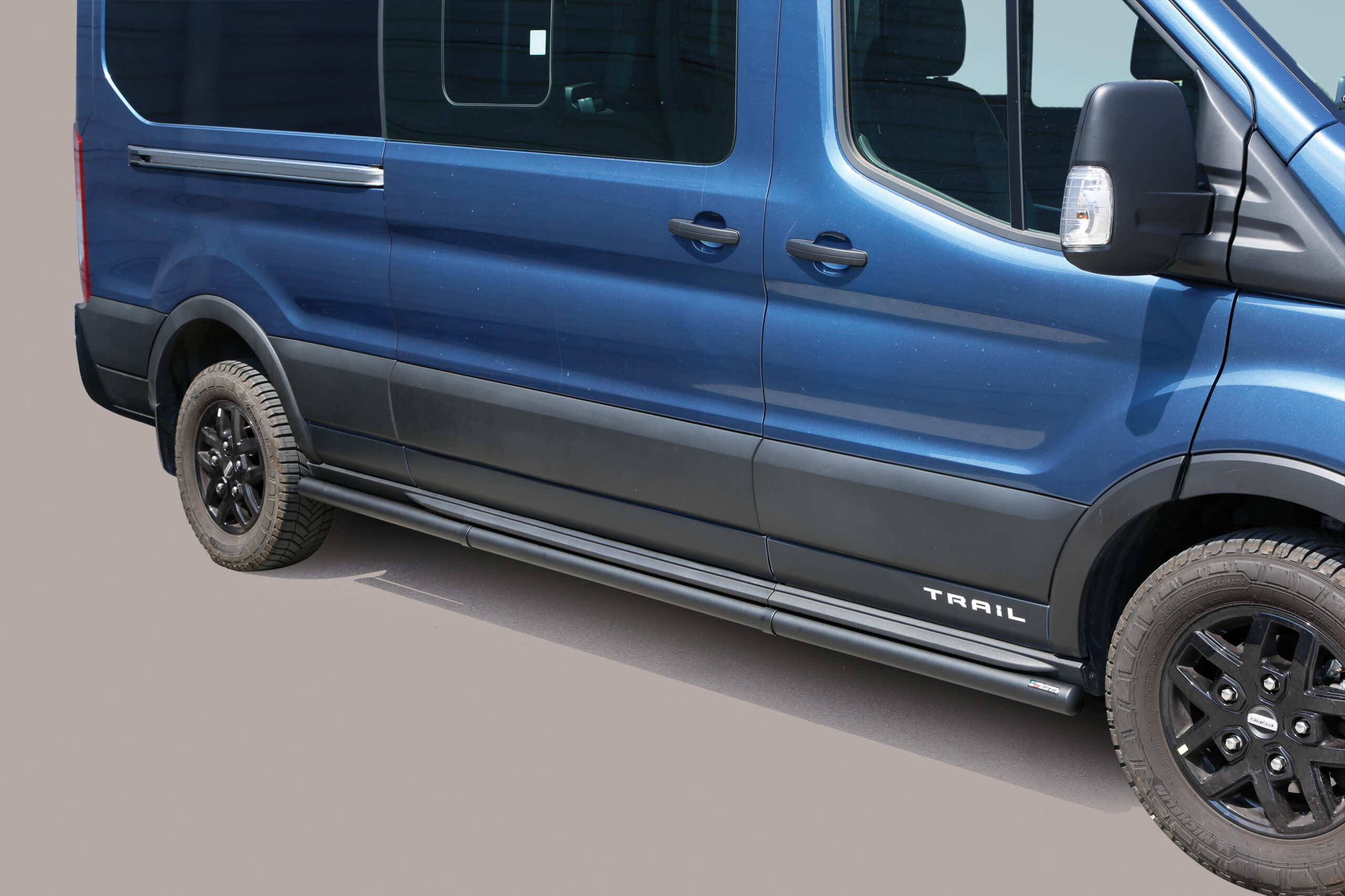 Mustaksi pulverimaalatut tyylikkäät kylkiputket Ford Transit 4×4 Trail 20- malliin.