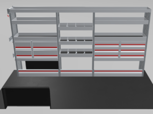 Toyota Proace Maxi L3H2 koko vasemman seinän hyllyratkaisu jykevillä laatikostoilla.